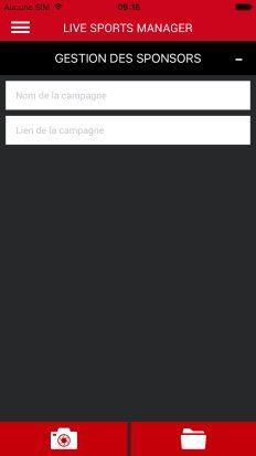 Pour ajouter une campagne, cliquez sur le + à côté du titre gestion des sponsors. Un champ permet de saisir le nom de la campagne, un second permet de d'associer un lien au sponsor à créer. Si ce lien est renseigné, le supporter pourra cliquer sur l'écran de démarrage de l'application et être redirigé à l'adresse renseignée ici.