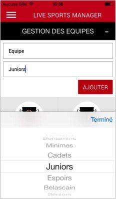 Pour ajouter une nouvelle équipe, cliquez sur le +. Complétez le champ texte avec le nom de votre nouvelle équipe, puis allez dans le sélecteur pour choisir la bonne catégorie. Validez via le bouton Ajouter. Vous pouvez annuler l’opération en cliquant sur le - à côté du menu Gestion des équipes.