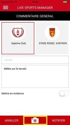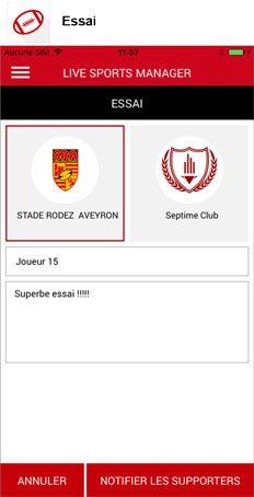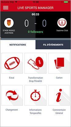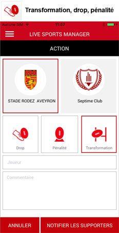 Vous pouvez notifier : les essais, les coups de pied, les cartons, les changements de joueurs, les informations temporaires (mi-temps, reprise, coup de sifflet final), commentaire général vous permet d’ajouter toute information sur le match : une action, une blessure…
